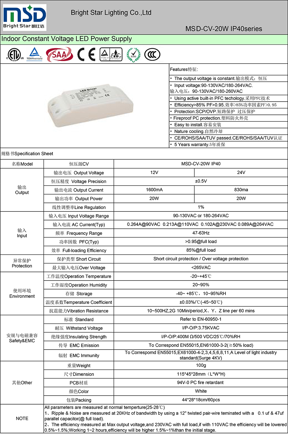 ●      CE/ROHS/SAA/TUV/ETL/CCC认证